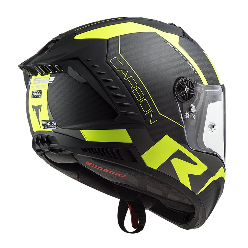Casco LS2 FF805 Thunder Carbon Raging1 Amarillo Matte. Casco integral racing de LS2 con homologación ECE 22.05. Fabricado en fibra de carbono. Dispone de una amplia pantalla muy resistente con predisposición para Pinlock® (incluido). Incorpora un avanzado sistema de ventilación y de acolchados interiores totalmente desmontables y lavables. Cuenta con sistema de extracción de emergencia. Cierre de doble hebilla.